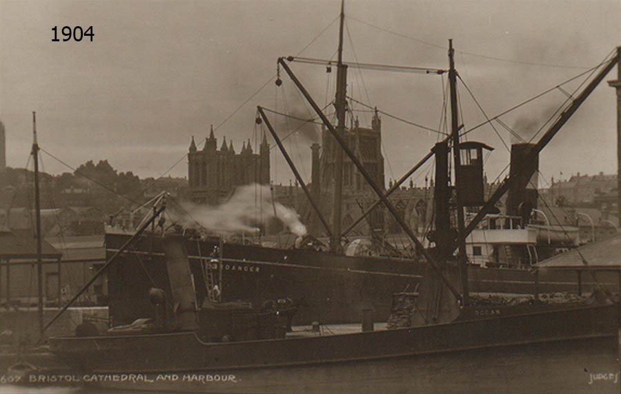 The cathedral dominates the skyline from this shot taken at the intersection of Narrow Quay and the Grove. The canal is filled with shipping including a steamer and a collier.