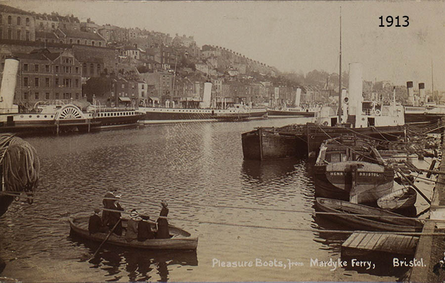The rowboat in the foreground is the Mardyke Ferry ferrying several people across the canal. The harbour was much more busy that day than it was the day I took my photo. Paddle steamers abound, many likely used for pleasure cruises out into the Bristol Channel. If you look carefully you can see a remarkable number of the buildings on the hill have remained in place over the decades.