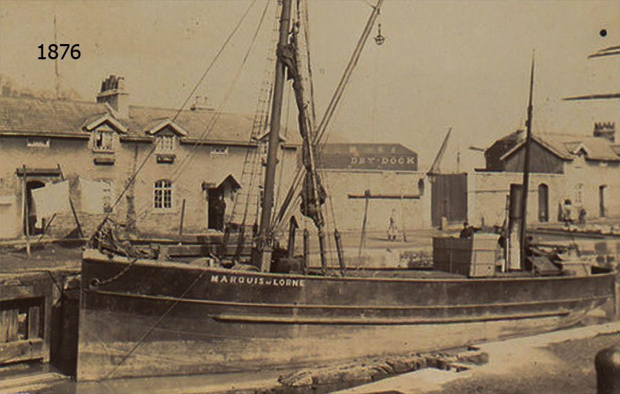 The ship "Marquis of Lorne" noses through a channel towards the swing bridge on its way out of the Floating Harbour. The dock cottages on the left have remained unchanged.
