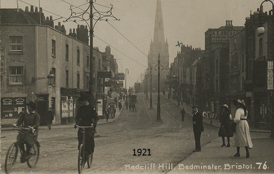 1920s View up Redcliff Hill, complete with women on bicycles - a fairly unusual sight in those days! All the women appear to be wearing the trendiest of hats - not surprising as Bristol had over one hundred milliners. The many little shops and businesses that lined the street are now a distant memory as the city council flattened them; road-widening was the reason given to provide greater flow between Bedminster and the Centre. Among the variety of shops were chemists, wine merchants and a fondly-remembered seller of hot peas and faggots. The sign of A.E. Orchard, (purveyor to the King and HRH The Prince of Wales) denotes his butcher's shop.
