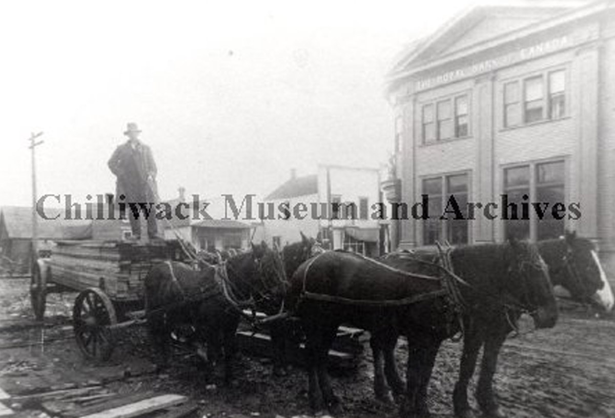 Sam Barclay stands proudly atop a four-horse team drawn wagon loaded with lumber from the Sam Trethewey Mill. The wagon stands in front of the Royal Bank building, at the corner of Main Street and Wellington Avenue. Sam Barclay worked for Sam Trethewey at his mill on Castleman Road in Rosedale, which burned down sometime in 1910 - 11, shortly after this photo was taken.