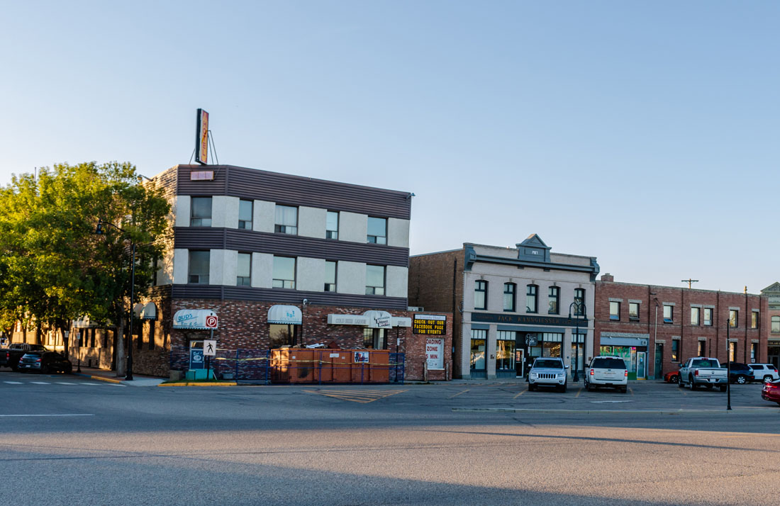 This grand hotel building was constructed between 1907 and 1908 on the prominent corner across from the local railway station; it was built after the original wood frame Albion Hotel had been destroyed in the downtown fire of 1906. A.T. Inskip was the owner of both the Adelphi and the new Lacombe Hotel buildings and, following the fire, Inskip acquired more land from the flat iron block to build his dream business – an impressive three-storey hotel, which also contained the Town post of fice at one time. Using locally cast cement blocks to create the look of sandstone, Inskip designed the hotel in the style of Italian Renaissance. The building originally had two street facades to increase street presence and to allow patrons easy access to the building, and was accessible through three entrances.
